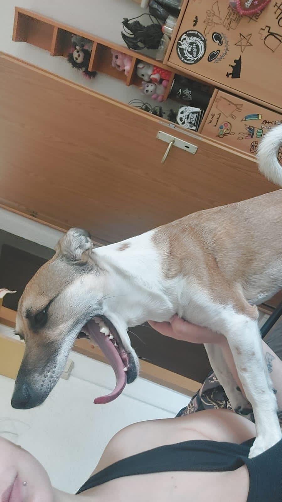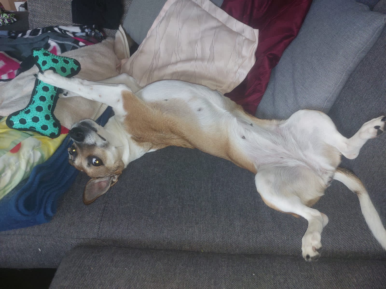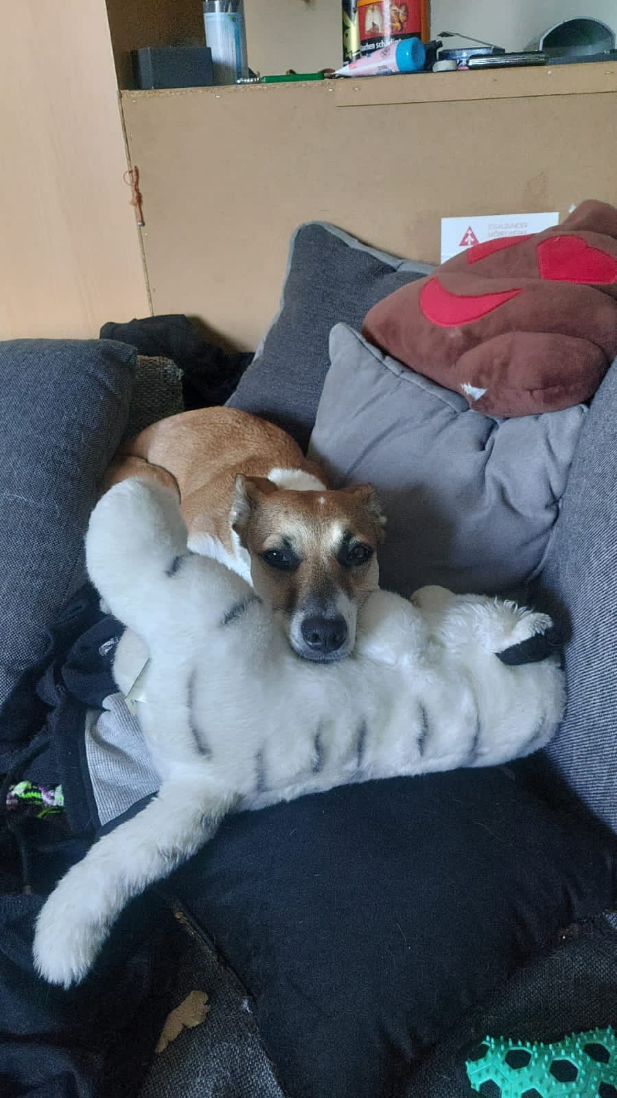 Ihr liebstes Spiel ist rassetypisch das hetzen und packen von Spielzeug, hierbei kann sie mit Frust nicht gut umgehen und wird dann laut.